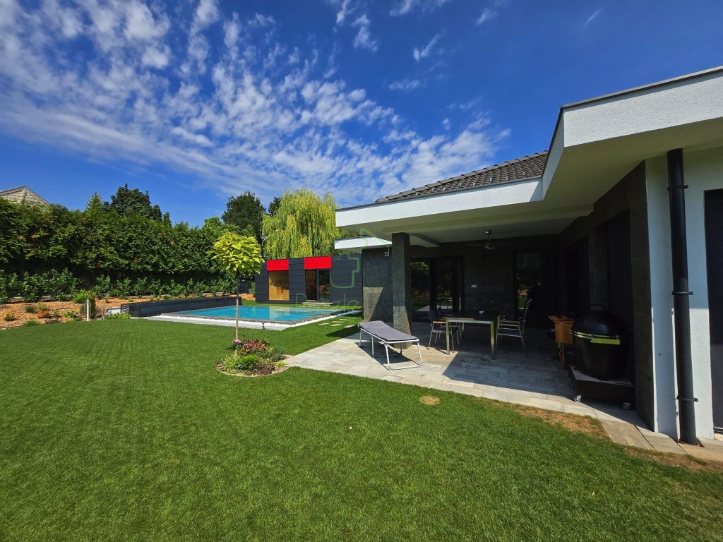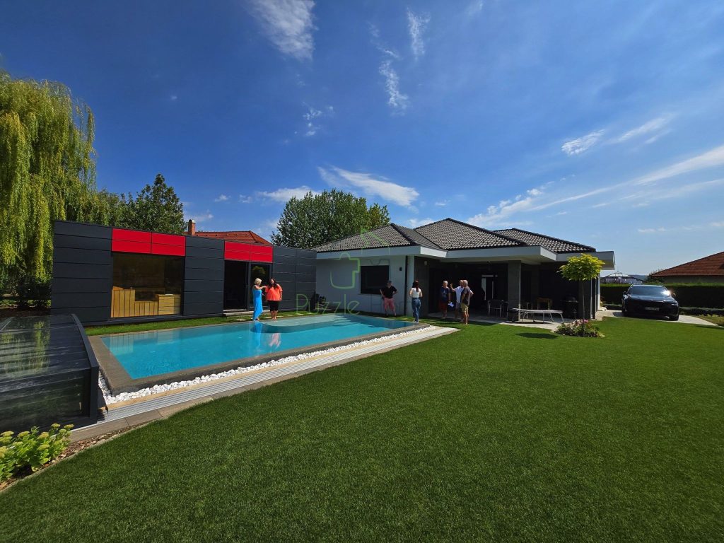 A bemutatott otthon egy acélvázas PuzzleHome készház, amely a legmagasabb kivitelezési színvonalat és kimagasló energiahatékonyságot nyújtja. Külön érdekessége, hogy nem csupán a ház minősége, hanem a gyönyörűen kialakított kert, a medence és a szaunaház harmóniája is lenyűgöző.