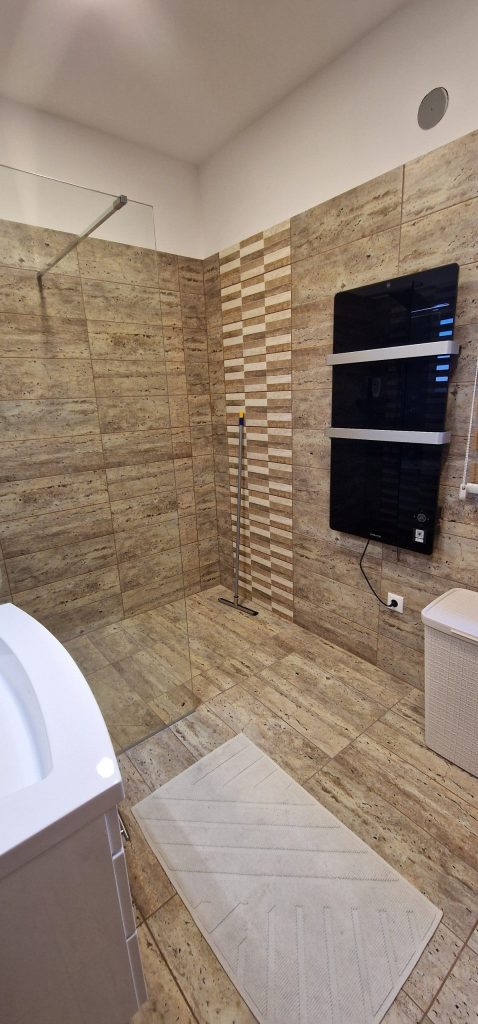 A házban mennyezeti hűtés-fűtés működik, melyet padlófűtéssel egészítettünk ki. A rendszert egy modern GREE hőszivattyú látja el energiával, összesen 500 literes puffer- és használati melegvíz-tárolóval.A belső hőmérséklet három zónában szabályozható, akár távolról is programozható.