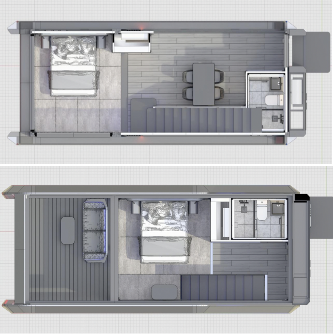 A teljes belső tér gyárilag előkészített, világítással, bútorzattal, LED-vezérléssel és két teljesen felszerelt fürdőmodullal (WC + zuhany + mosdó) érkezik.
