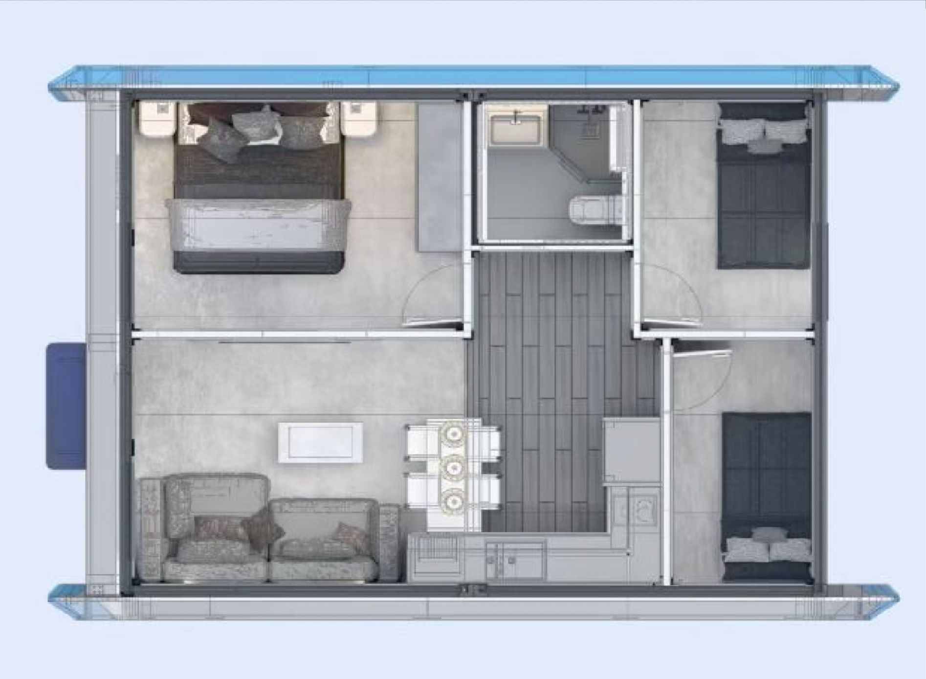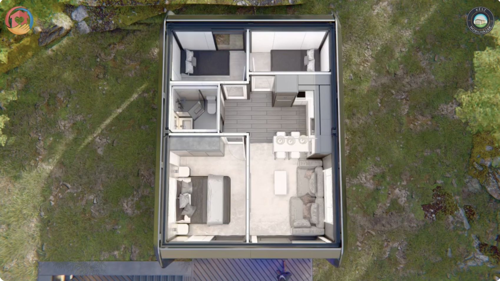 Capsulove SQ alakú moduláris mobilház (47 m² összterület • 3 hálószoba • kompakt családi modell)